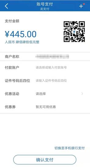 1.您通过手机消费时,选择“建行银行”进行支付,系统会自动跳转至我行的支付页面。填写“付款账户”、“证件号码后四位”,点击“确认支付”。