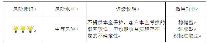 本产品为非保本浮动收益型理财产品,不保证本金和收益,预期收益、预计收益、测算收益、预期年化收益率等表述均不等同于实际收益。请您充分认识投资风险,谨慎投资。产品期限为8年(中国建设银行有权提前终止或展期产品),产品存续期内任一产品工作日接受申购/追加投资申请,客户的持有份额在封闭120天后,可于任意开放日申请赎回(超过单个客户累计赎回限额的赎回申请除外,巨额赎回时请以公告为准)。本期产品内部风险评级级别为3盏警示灯,风险程度属于中等风险。最不利情况下,资产组合无法回收任何本金和净收益,客户将损失全部本金。产品适合于稳健型、进取型及积极进取型客户。