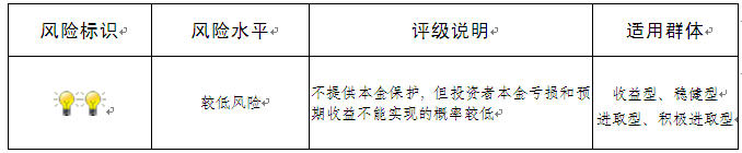 本期产品为非保本浮动收益型理财产品,不保证本金和收益,请您充分认识投资风险,谨慎投资。本期产品期限198天(中国建设银行有权对本期产品进行展期和提前终止),存续期内产品不接受申购或赎回申请。本期产品内部风险评级级别为2盏警示灯 ,风险程度属于较低风险。最不利情况下,资产组合无法回收任何本金和净收益,客户将损失全部本金。产品适合于收益型、稳健型、进取型、积极进取型客户。